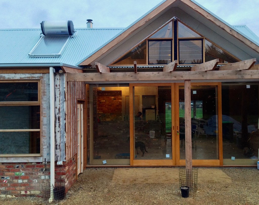 The house has been designed with passive heating and cooling in mind, with adequate eaves, north facing orientation for living areas, lots of cross-ventilation for passive cooling, attached greenhouse to the north, an internal brick wall for thermal mass, double-glazed windows throughout and a pergola to the north that will provide shading during summer by means of grapevines.