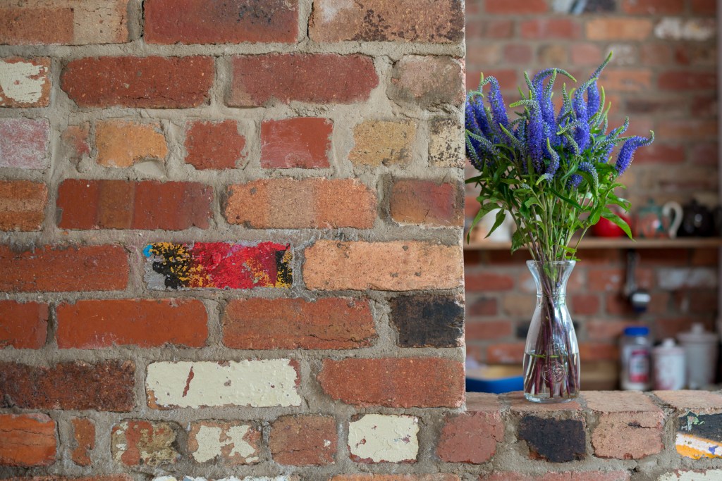 An internal recycled brick wall runs through sections of the bathroom, kitchen and living areas and provides a source of thermal mass. Internal thermal mass aids in reducing temperature swings inside the home, helping it to stay cooler for longer in summer and warmer for longer in winter. The wall forms part of the kitchen area where the combustion stove is located, further aiding in this process.