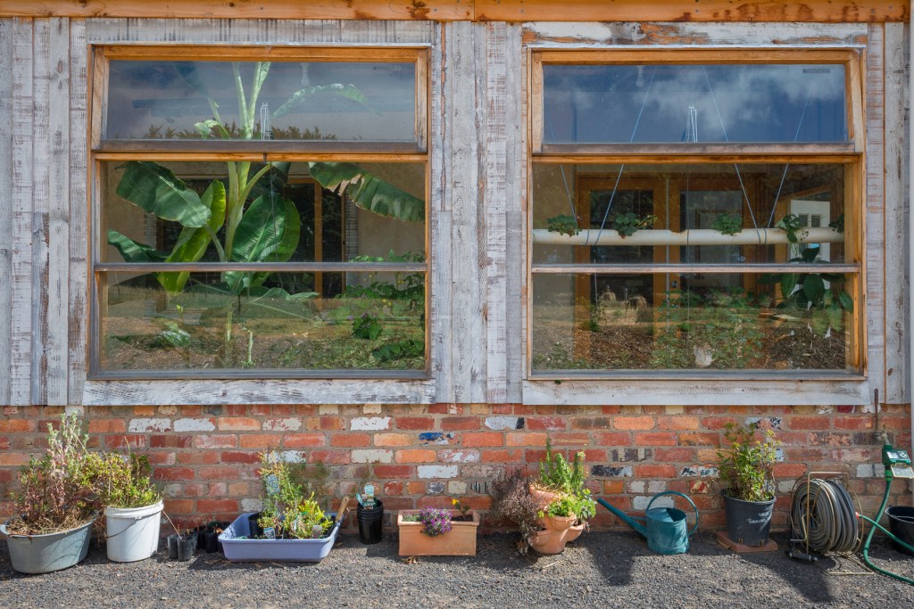 An attached greenhouse is an addition to the northern side of the home. This is built from recycled cedar windows and recycled bricks and will be an additional heat source for the home during winter as well as providing a sheltered growing area and additional living space. UV resistant roofing and temperature regulated awning windows will reduce heat gain during summer.