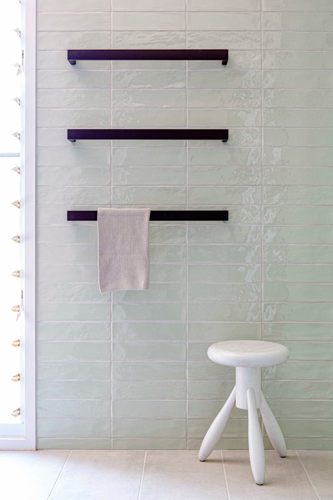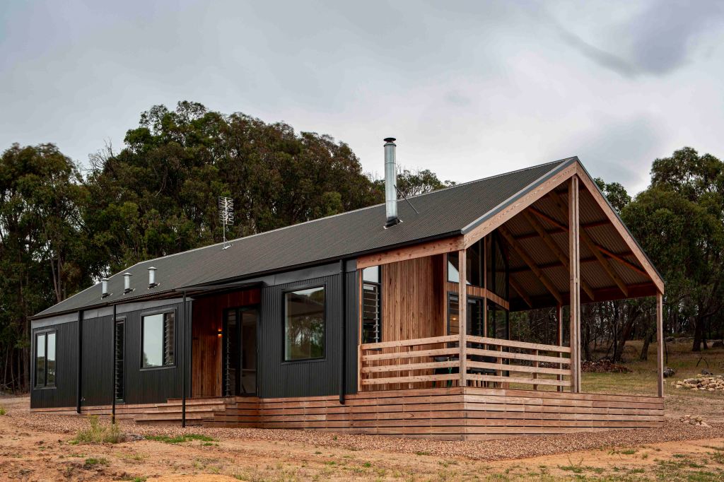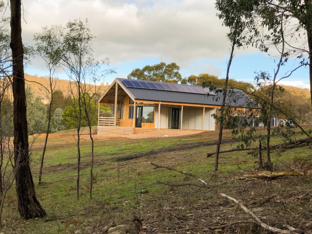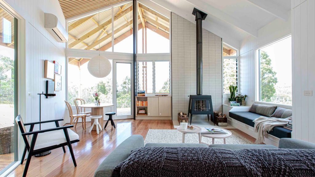 The design includes 1 bedroom downstairs, with a loft above for extra space, accessed by a custom built timber ladder. The downstairs living area has custom timber joinery, exposed lime washed rafters and large windows to a view of the surrounding hills. A combustion stove provides heating during winter and a reverse cycle system will provide cooling during summer.